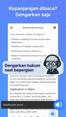 Inti dari AI Reads Law adalah Chat AI yang revolusioner, memungkinkan Anda mengajukan pertanyaan spesifik tentang undang-undang, putusan, terminologi hukum, dan banyak lagi, dengan jawaban yang cepat dan komprehensif. Bayangkan sebuah konsultan hukum cerdas yang merangkum poin-poin krusial atau memberi panduan instan kapan saja. Fitur unggulan lainnya adalah Perpustakaan Hukum Audio, yang mengubah dokumen penting seperti UUD atau keputusan Mahkamah Agung menjadi format yang dapat didengarkan. Selain itu, kemampuan Text-to-Speech (TTS) yang adaptif dapat mengubah teks hukum apa pun – dari buku hingga dokumen pengadilan – menjadi buku audio pribadi Anda, ideal untuk belajar di mana saja.