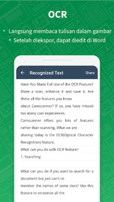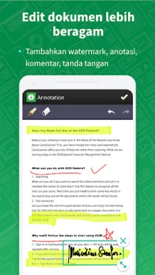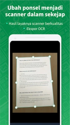 Dengan CamScanner, mendigitalkan setiap lembar menjadi semudah mengambil foto. Mulai dari kuitansi penting, catatan rapat, faktur bisnis, hingga diskusi di papan tulis dan kartu nama, semuanya dapat diabadikan dengan presisi luar biasa. Teknologi pemotongan cerdasnya memastikan setiap hasil pindaian optimal, menyajikan teks dan grafik dengan kejernihan, ketajaman, serta resolusi warna premium. Fitur OCR unggulan dalam CamScanner juga memungkinkan Anda untuk mengekstraksi teks dari gambar atau PDF, sehingga Anda bisa dengan mudah mencari, mengedit, atau membagikan informasi tersebut.